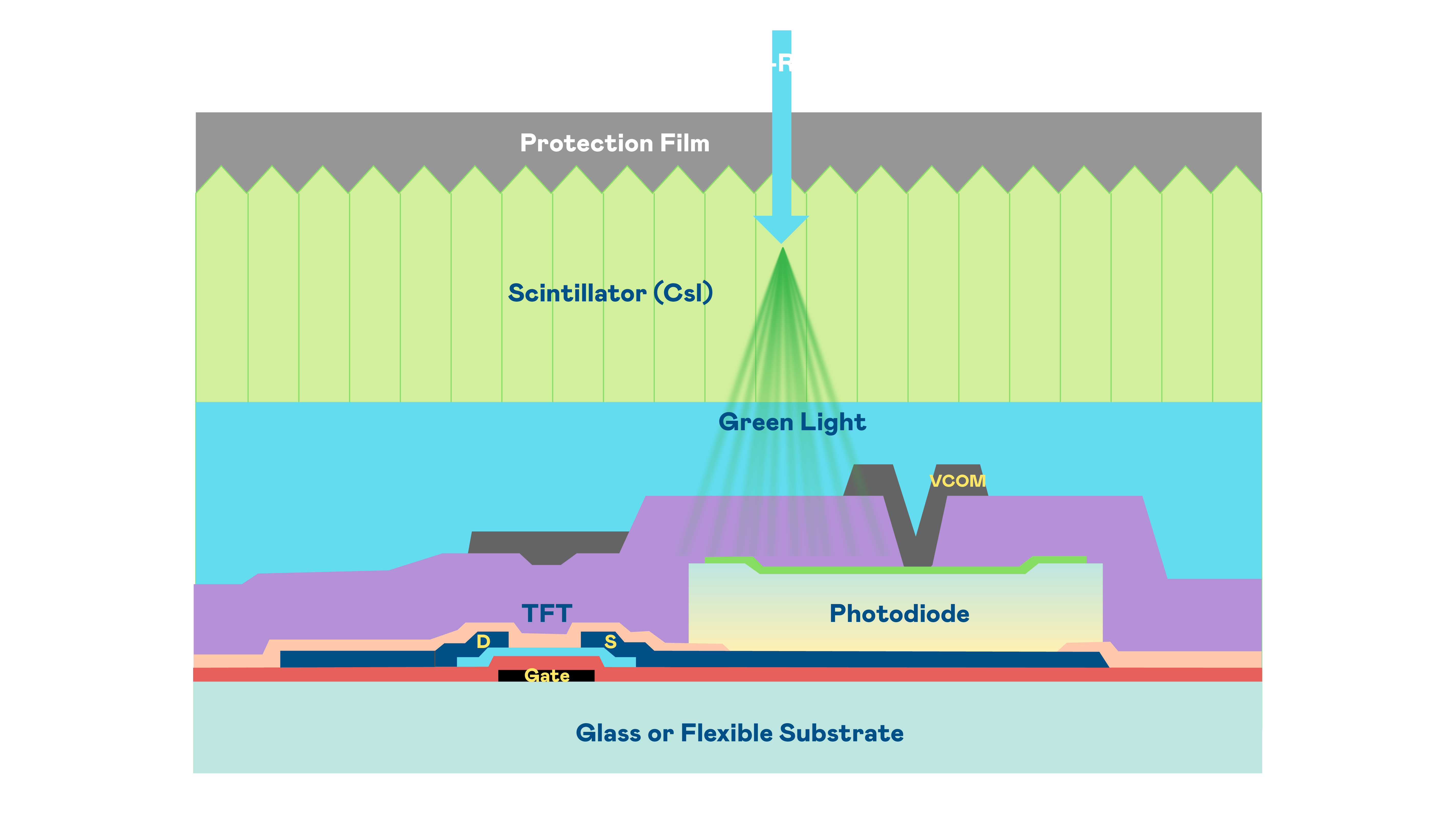 LEwin乐玩的X光影像感测阵列使用薄膜电晶体 (TFT) 作为每个像素的读取开关,搭配光电二极体(Photodiode)的光电转换元件,用以感测X光影像讯号。